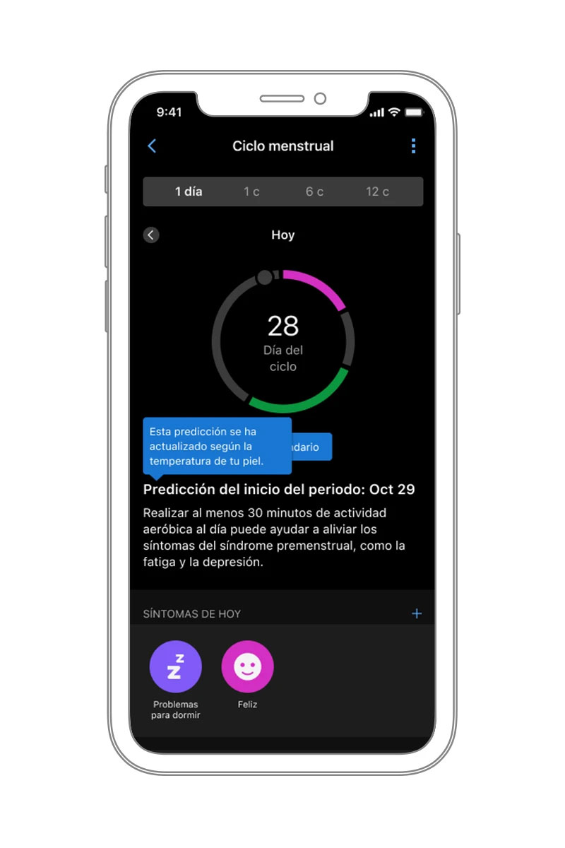 Con la temperatura de la piel, obtendrás más información sobre tu ciclo menstrual, incluidas mejores predicciones del periodo y estimaciones de ovulaciones anteriores. Realiza un seguimiento de tu ciclo menstrual o embarazo, además de recibir formación sobre ejercicio y nutrición en la aplicación Garmin Connect.